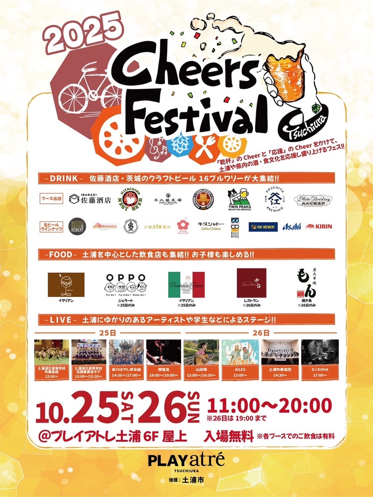 茨城県土浦市のプレイアトレ土浦で開催する、お酒と食のイベント「TSUCHIURA Cheers Festival 2025」に山田翔が出演します!